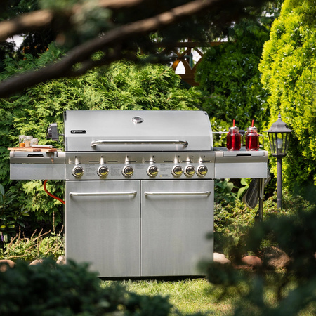 - Moc 22,05 kW, Żeliwny, Nierdzewny, 6 palników głównych + 1 palnik boczny, 5069,5 cm² - powierzchnia grillowania, Szafka na butlę, 2 żeliwne ruszty, Półka boczna z tacką, Wieszaki na akcesoria, Termometr, Zapalnik elektryczny, Kółka z wbudowanym hamulcem,