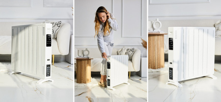 - Moc: 2000W, grzejnik konwektorowy, miedziana grzałka niskotemperaturowa, programator 24-godzinny, 3 stopniowa regulacja mocy, elektroniczny termostat, funkcja ECO, pilot zdalnego sterowania, czujnik przechyłu, wyświetlacz LED.