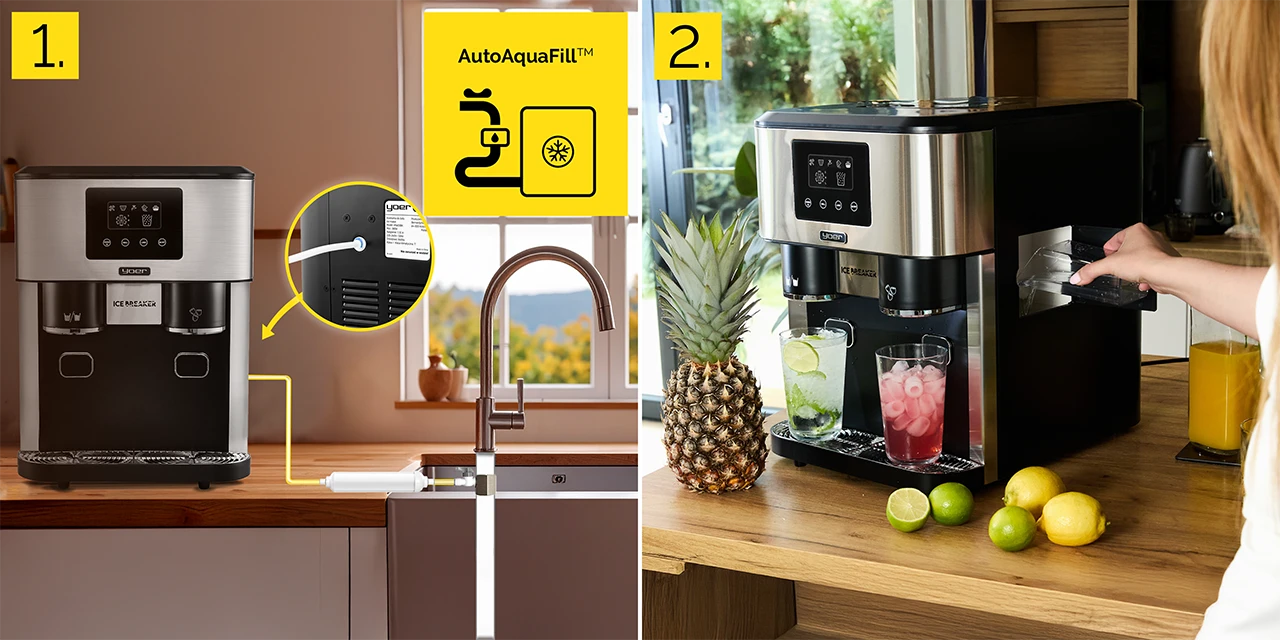 1️⃣Technologia AutoAquaFill™- automatyczne uzupełnianie wody -po podłączeniu kostkarki do stałego źródła wody