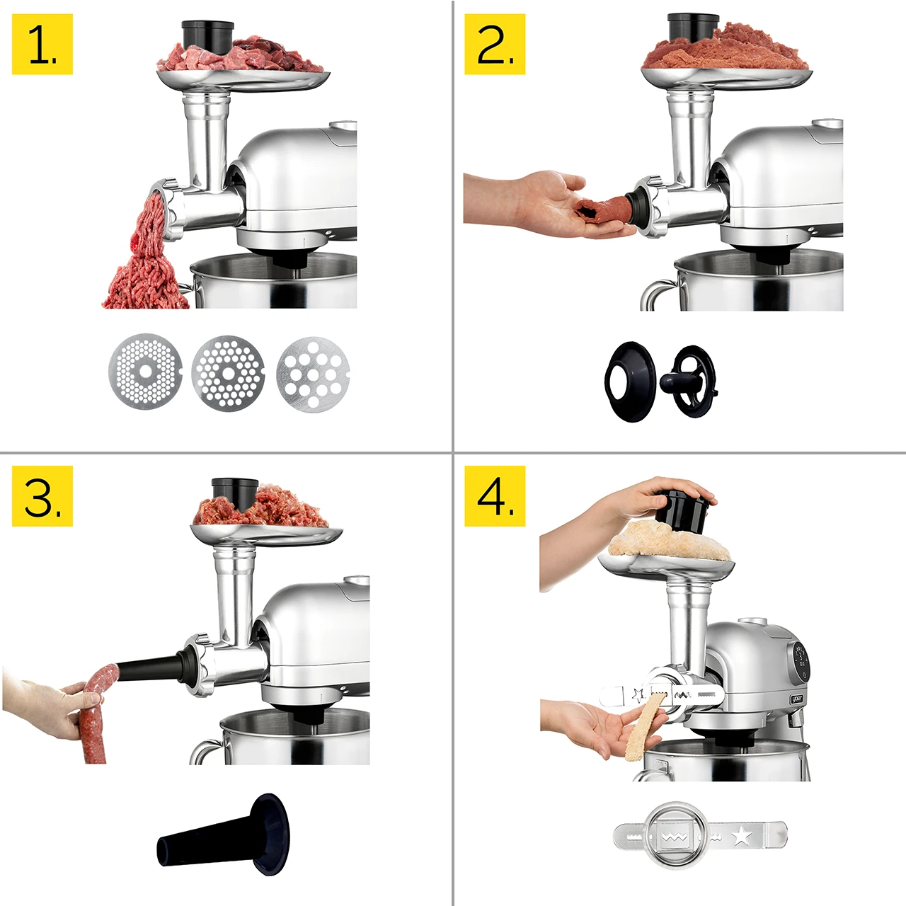 - 8w1 - mikser, blender, maszynka do mielenia mięsa, młynek do mielenia, szatkownica, nadziewarka do kiełbasy i klopsów kebbe, ciastkarka