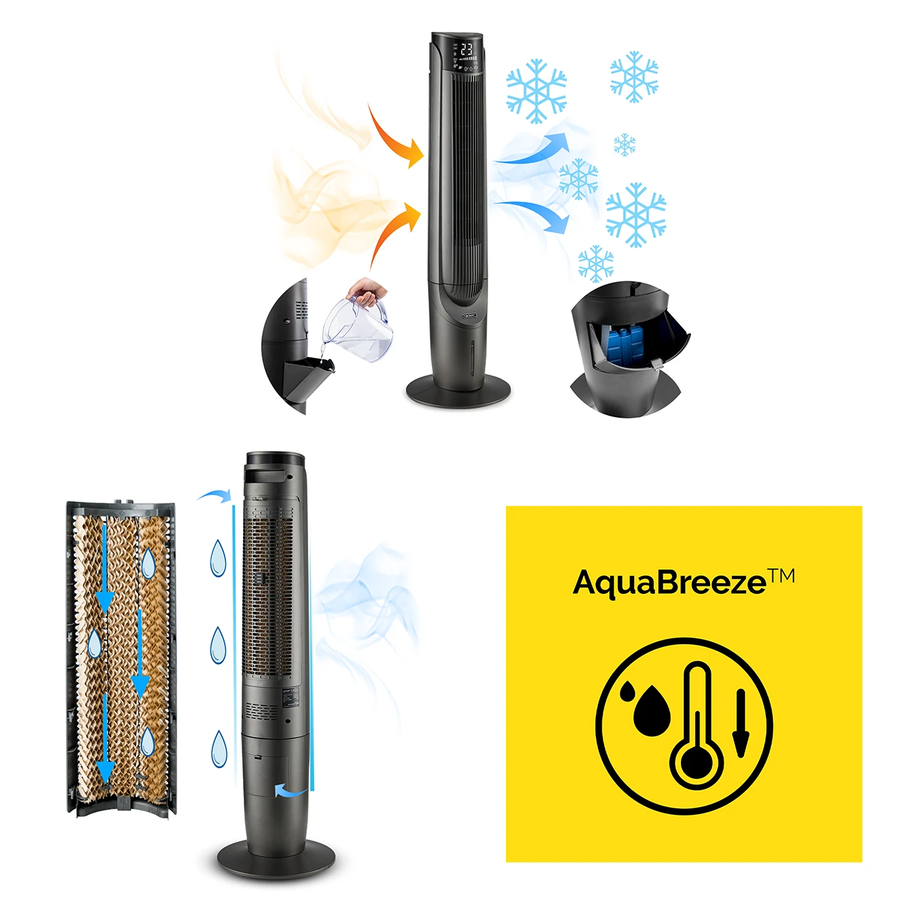 ✅ Technologia AquaBreeze™ -chłodzenie ewaporacyjne - napełnij zbiornik wodą, a klimatyzer przepuści powietrze przez specjalny materiał zwilżony wodą ze zbiornika aby je: