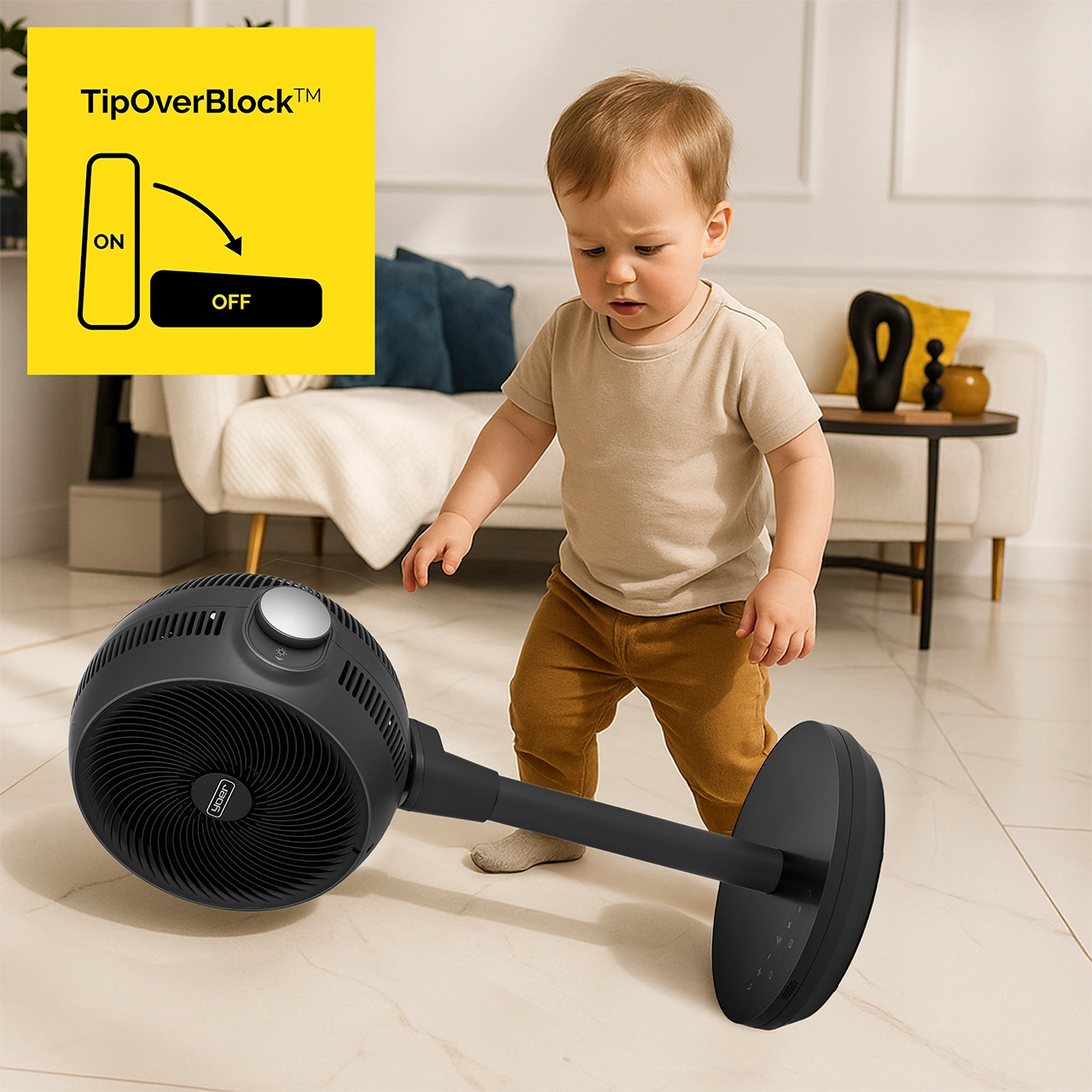✅ Technologia TipOverBlock™ - jeśli termowentylator zostanie przypadkowo przewrócony – np. przez dziecko czy zwierzaka – automatycznie odetnie zasilanie i zatrzyma pracę.